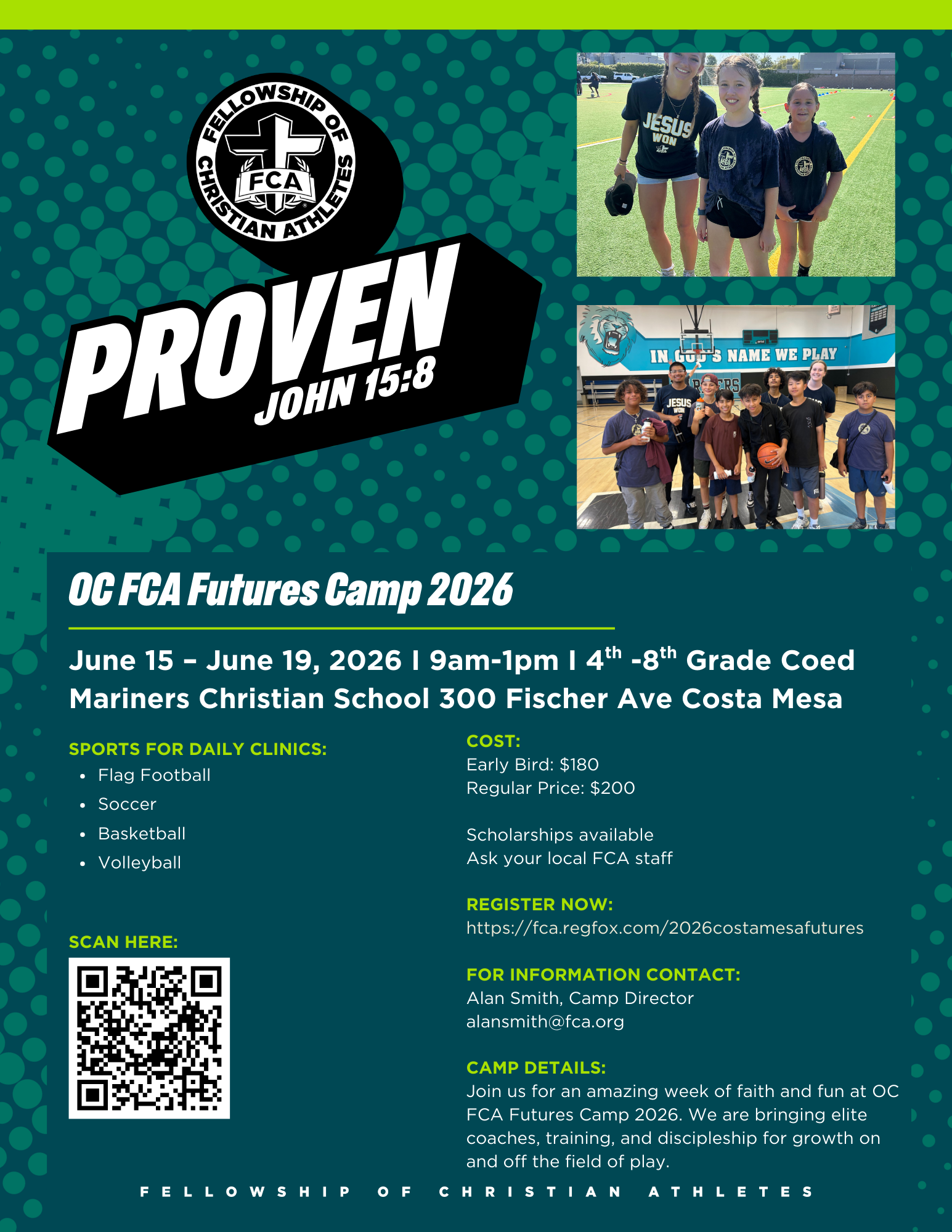 FCA Futures Camp is a local camp designed for young athletes to enjoy training in a variety of awesome sports while building a solid connection between faith and athletic pursuit. We will have high level coaches and volunteers helping your son or daughter develop skills in 4 different sports throughout the week, concentrating on a new sport each day, culminating in a day of different competitions on Friday. Camp will be hosted on the beautiful campus of Mariners Christian School in the heart of Costa Mesa, CA.